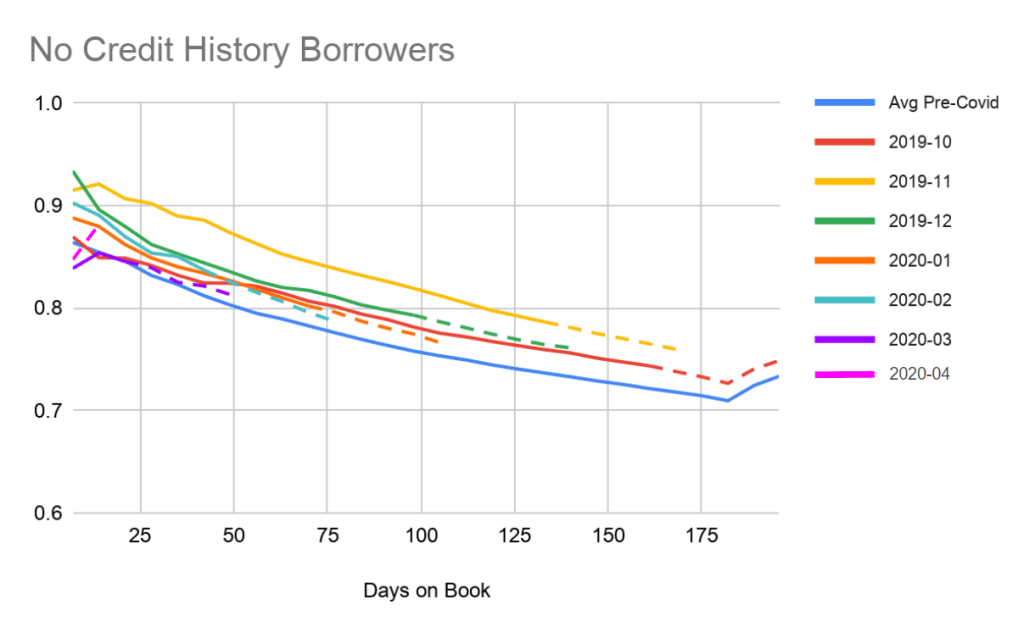 Now, one way to achieve this result would be to let existing customers repay and then “improve” future cohorts by tightening credit policy just to very high quality or existing customers. Of course, we did make some changes to our credit policies but these have only decreased approvals by around 5%. But, generally speaking, PayJoy has continued lending to new customers with little (Fig. 2) or no credit (Fig. 3) and their repayment has done similarly well.